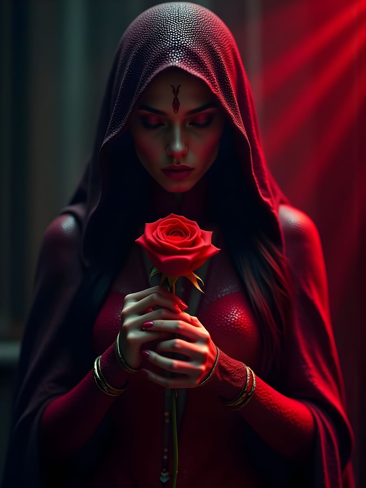 <lora:HyperPhotoRealism:1.0><lora:Crimson:1.0> A hauntingly beautiful depiction of a Crimson Woman as a being woven from shadows and starlight, offering a single, perfect, crimson rose to a fading world as a gift. Rendered in a photorealistic style with surreal, dreamlike elements. Professional photography, ...