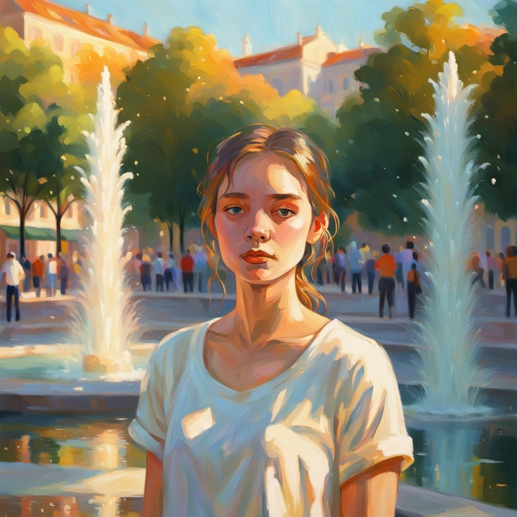 A vibrant impressionistic painting of a young woman near a fountain in a city. The artwork features soft brushstrokes, warm golden light, and pastel colors with soft shadows.