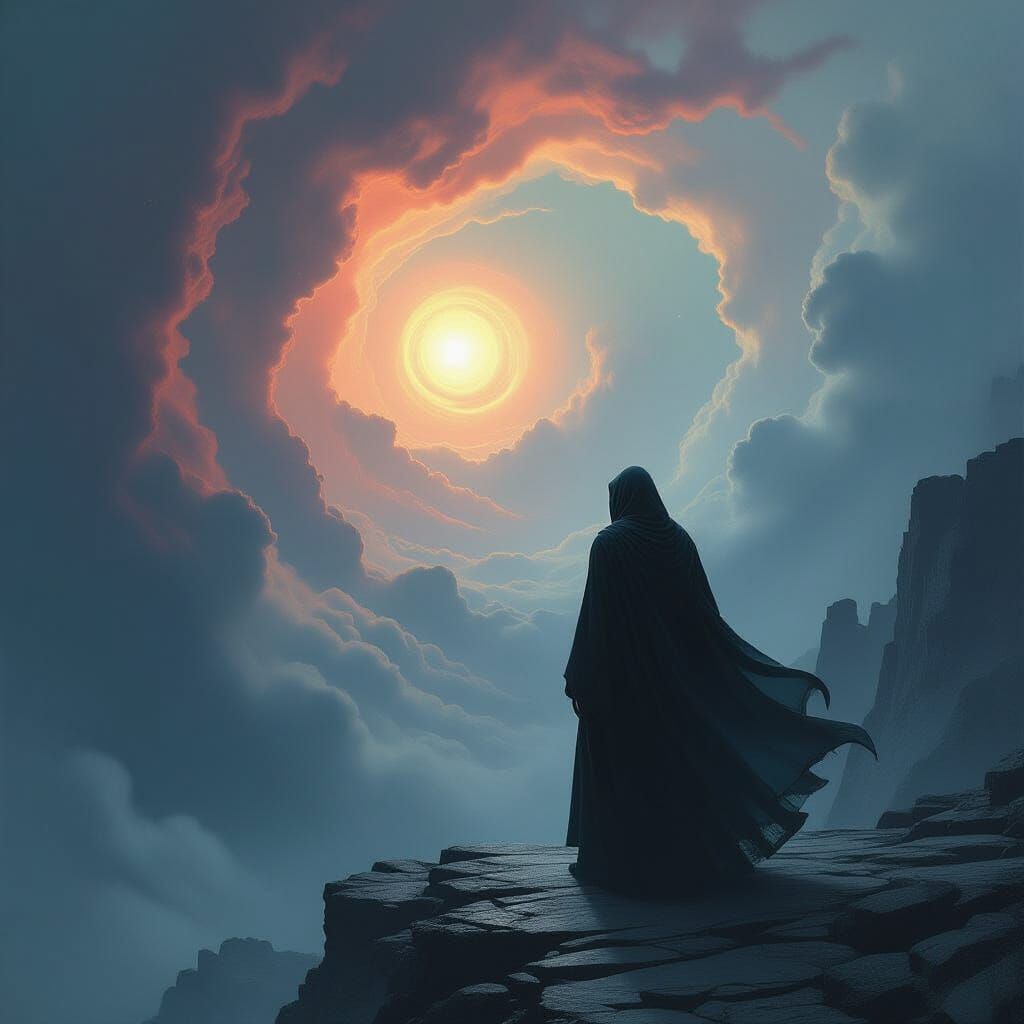 A solitary, mysterious figure cloaked in shadow stands before a cosmic storm, surrounded by swirling nebulae and starlight. Dark fantasy art with avant-garde depth.