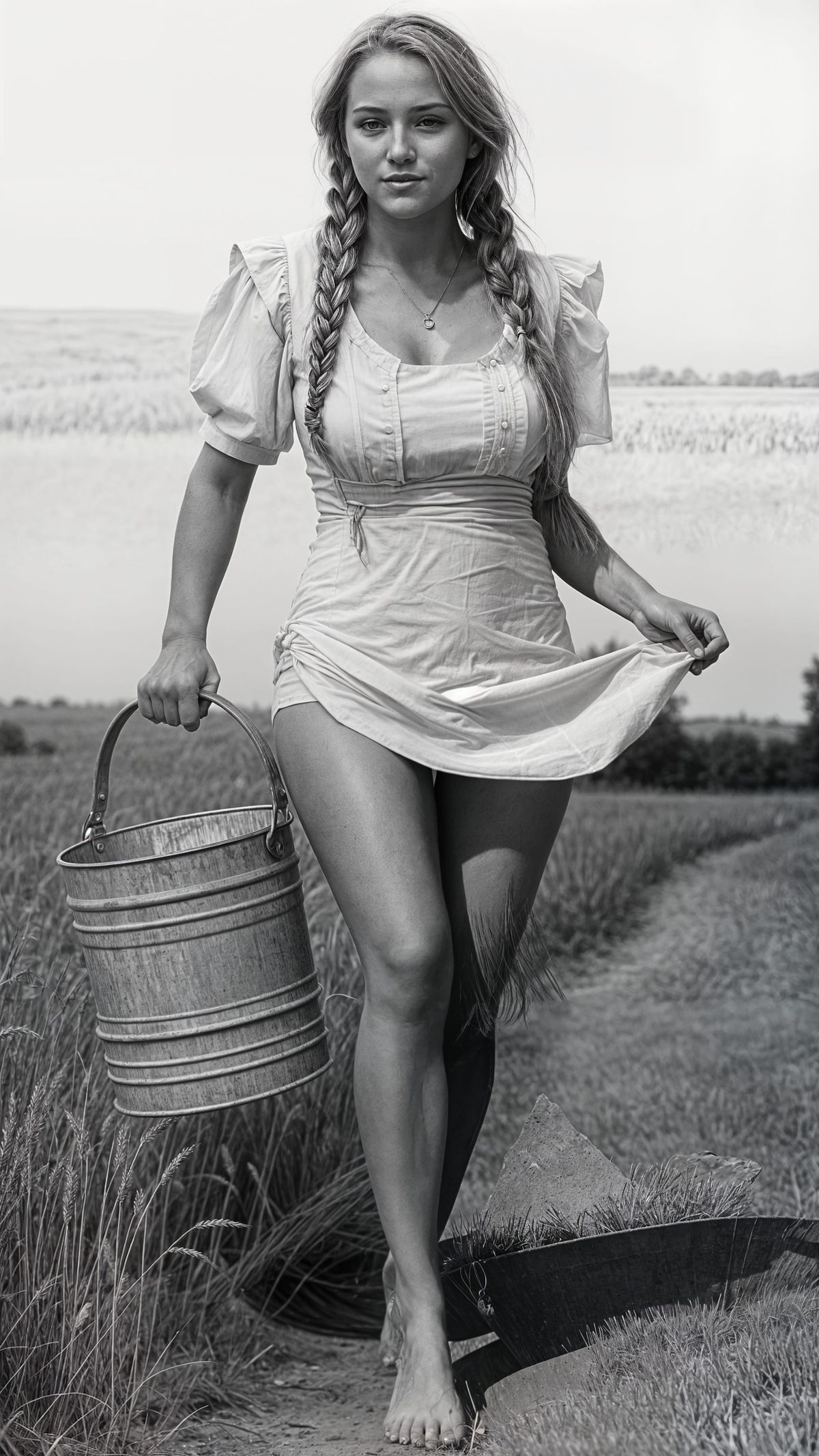This image shows a captivating black and white portrait of a woman with braided blonde hair, wearing a short white dress, as she walks barefoot through a wheat field. The soft, natural light and shallow depth of field create a dreamy atmosphere, evoking a nostalgic mood.