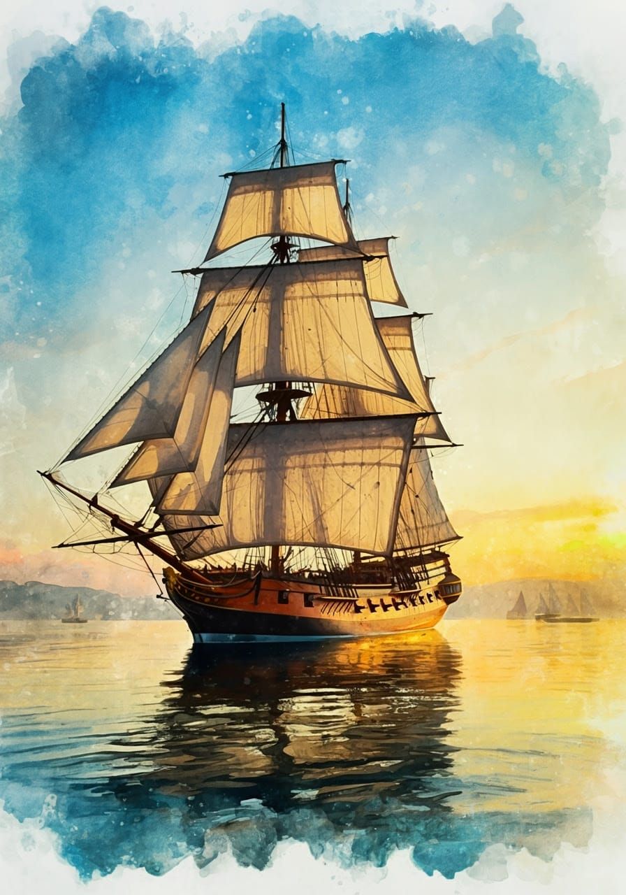 This serene watercolor painting depicts a majestic sailing ship navigating tranquil waters. Employing fluid watercolor techniques, the artist captures the ship's grandeur amidst a luminous sky, with warm hues and soft blends evoking a sense of maritime adventure.