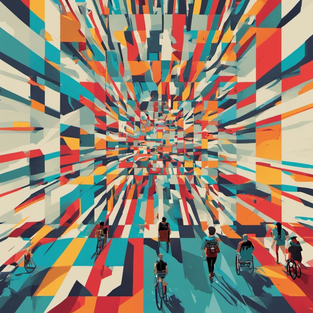This image shows an accessible path in a pop art style, leading towards Wyoming. The digital artwork employs screen printing techniques, geometric Bauhaus elements, and triadic colors.