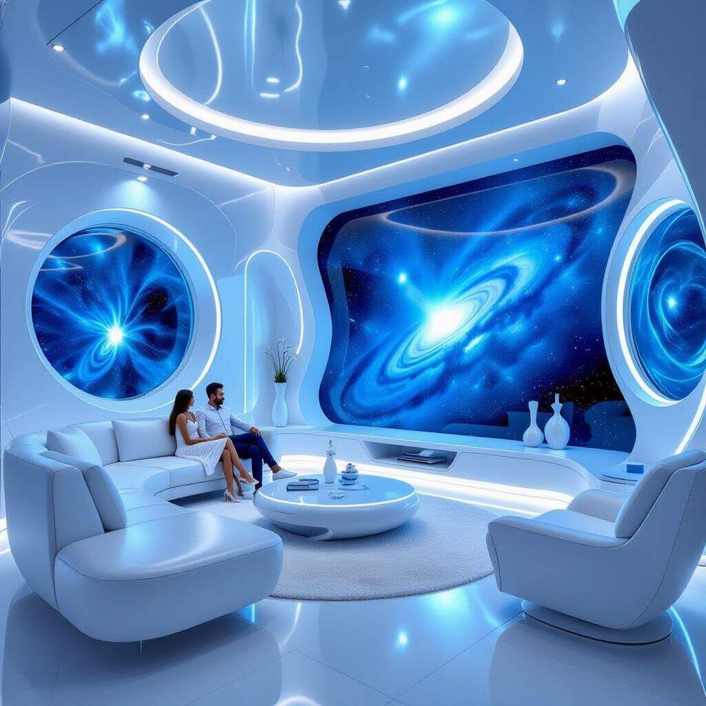 This image shows a luxurious and dreamy modern living room bathed in electric blues and pure whites. The scene, depicting a couple, evokes a sense of weightlessness and futurism as 3D rendered digital art.
