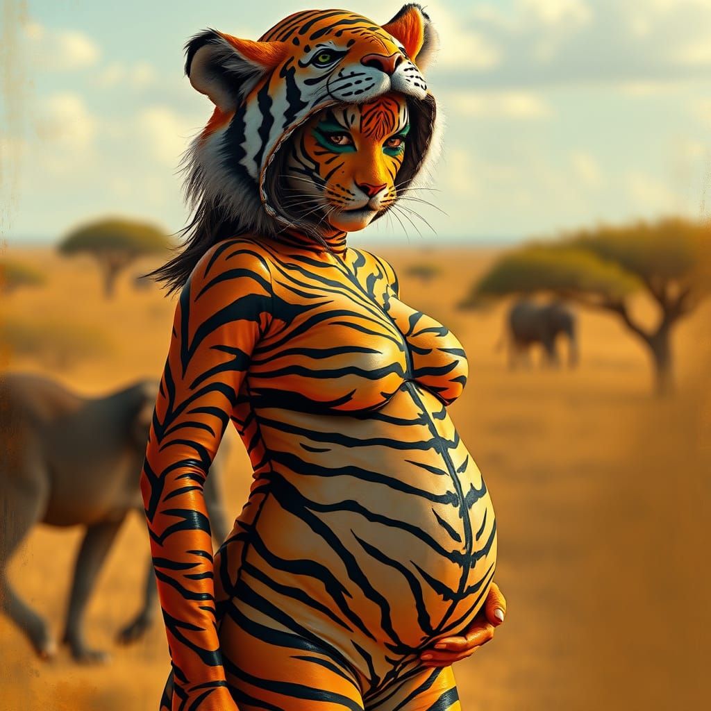 This image shows a pregnant woman in a tiger costume on the African Savannah. The image is reminiscent of vibrant comic art with bold textures.