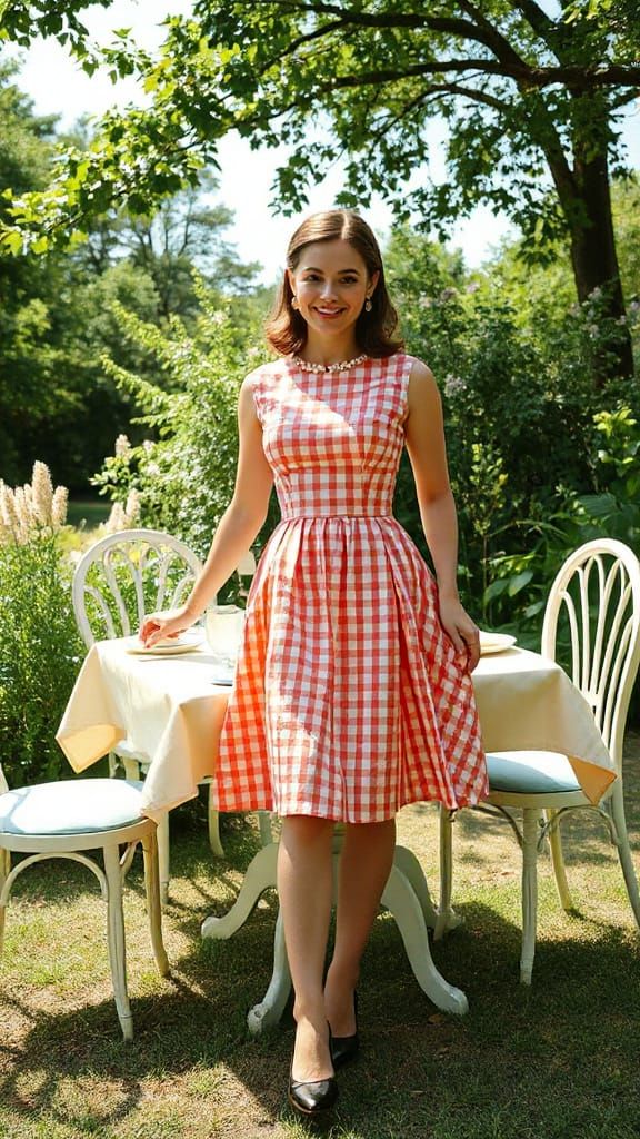 A vibrant image of a woman arranging a breakfast table in a sunlit garden. She is wearing a 1950s-style dress. Rendered as hyperrealistic splash art with detailed textures.