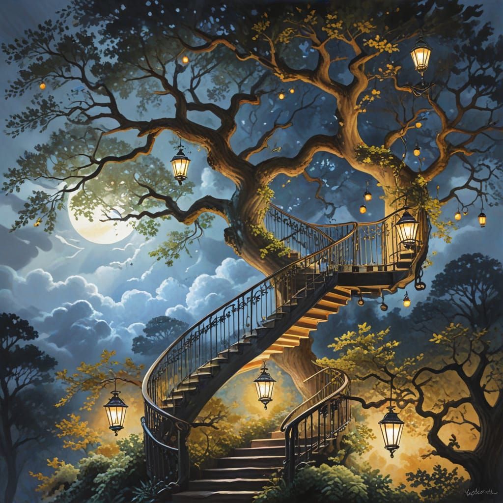 This enchanting gouache painting depicts a winding staircase ascending into majestic oak clouds, adorned with lanterns that add a touch of whimsy to the serene atmosphere.