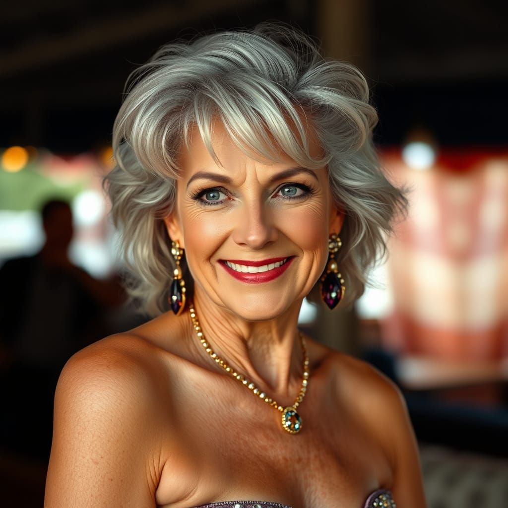 This image shows a beautiful woman in her sixties with a slight smile. She is wearing hair jewelry and a strapless top. Her silver hair is styled provocatively.