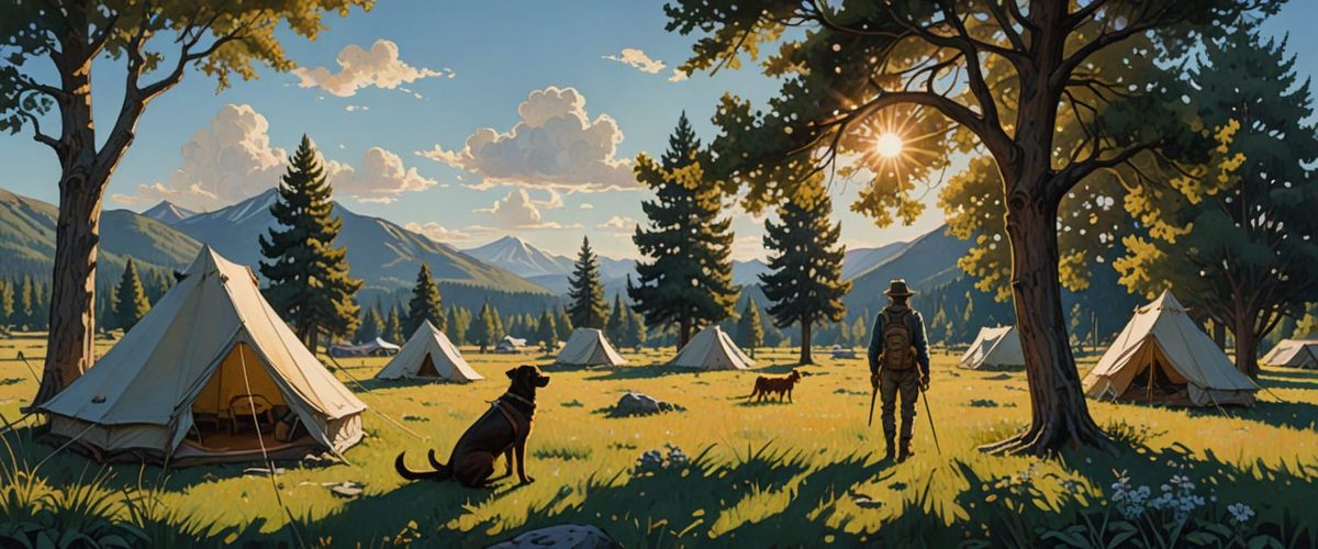 This image shows girls in an alpine meadow with tents and a puppy. The style is reminiscent of comic books, using gouache and watercolor techniques with bright colors and volumetric lighting.