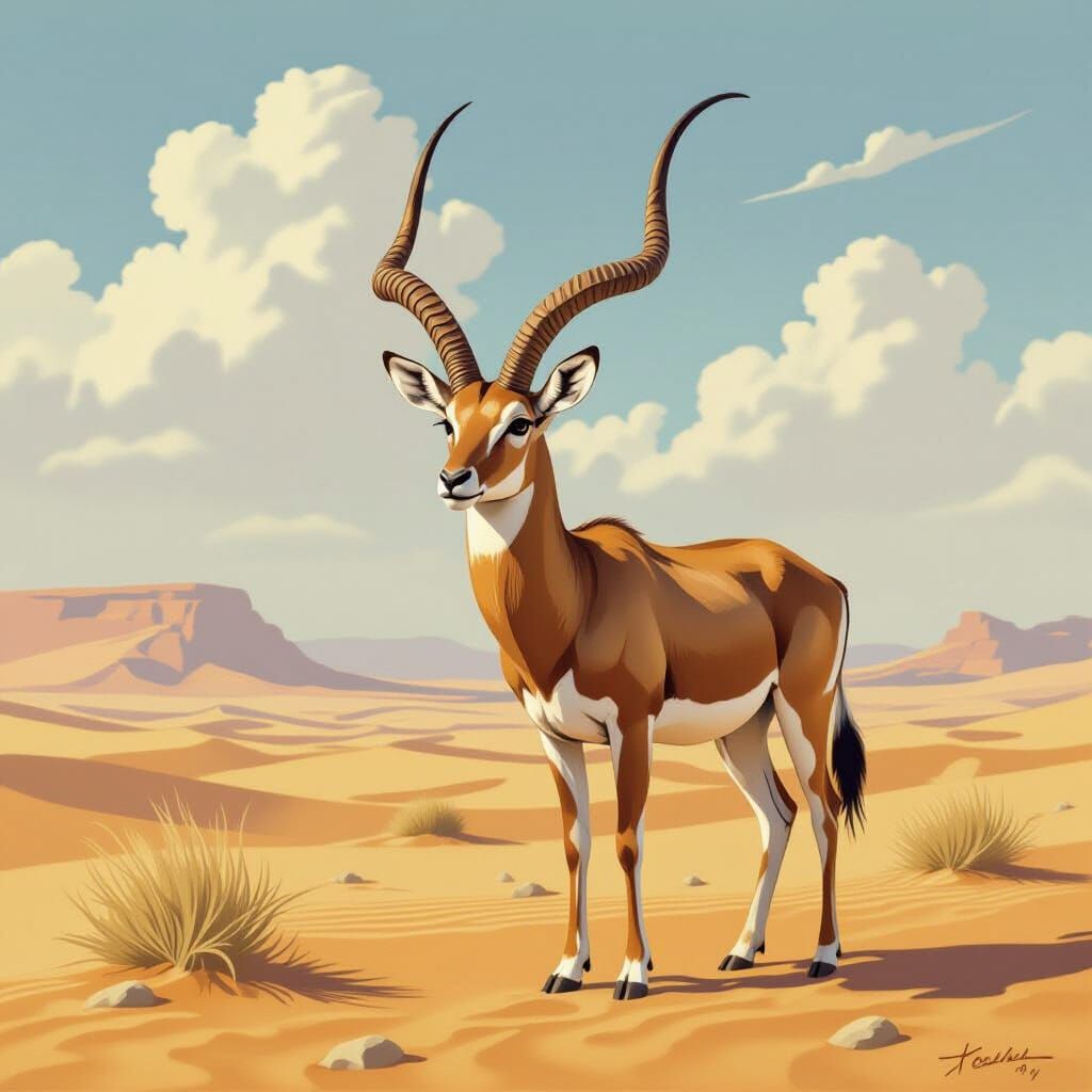 This image shows an antelope with long, spiraled horns standing in a desert landscape. The artwork is rendered in a realistic painting style, capturing the fine details of the scene.