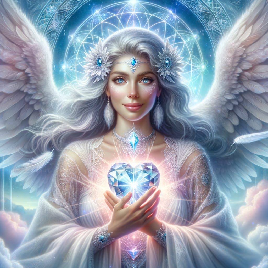A digital portrait of a divine feminine figure, Archeia Celestina, holding a radiant heart crystal. The artwork features flowing white and blue robes, feathered wings, and sacred geometric symbols set against an ethereal aurora.