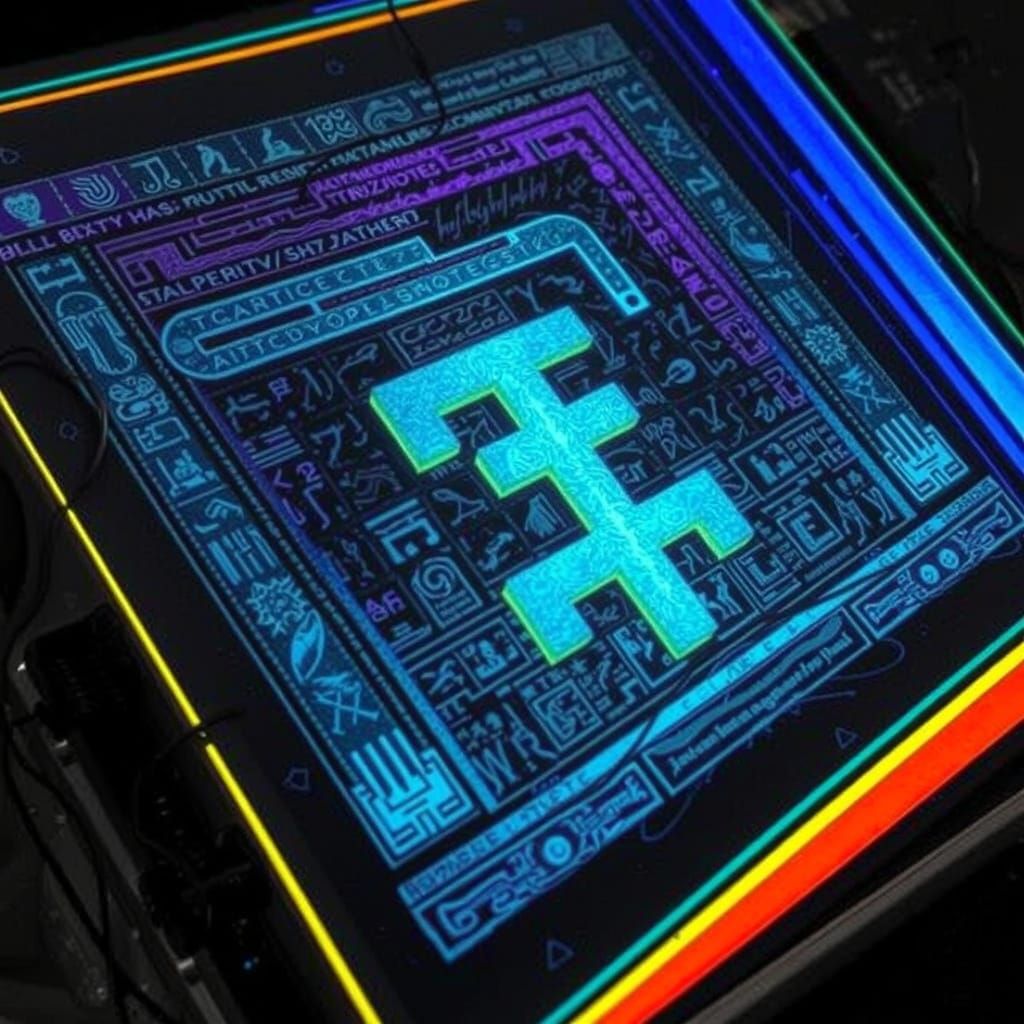 A digital rendering of a mystical figure amidst ancient hieroglyphs. The figure emanates a pulsing aura, realized in an 8-bit, pixelated style with vibrant neon colors.