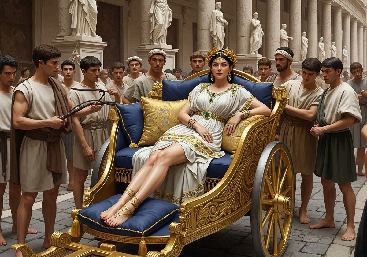 This image shows a Roman Empress lounging in her golden chariot, surrounded by servants on a busy street. The artwork suggests impressionistic and romantic styles, with a focus on natural lighting and sharp details.
