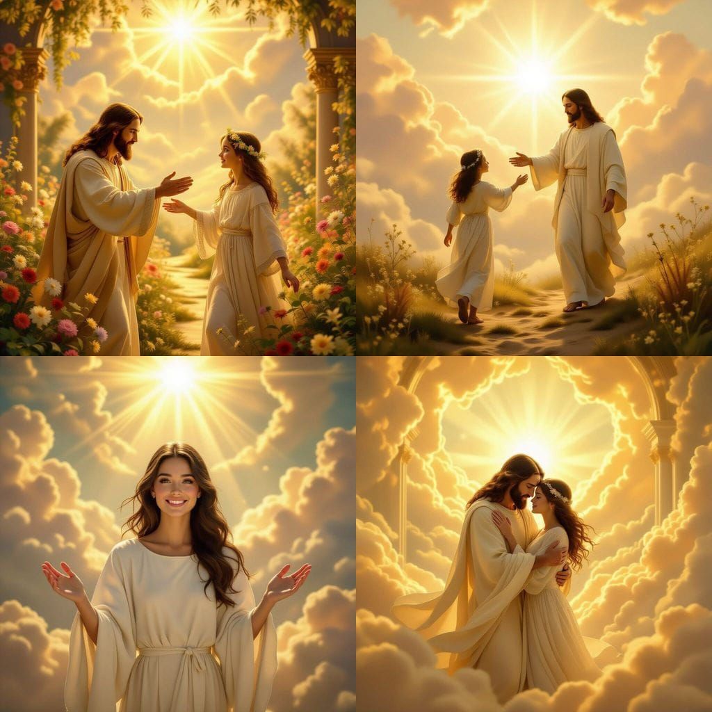 This image depicts Jesus welcoming a young woman into His heavenly kingdom, symbolizing peace and eternal welcome. A serene and spiritual scene.