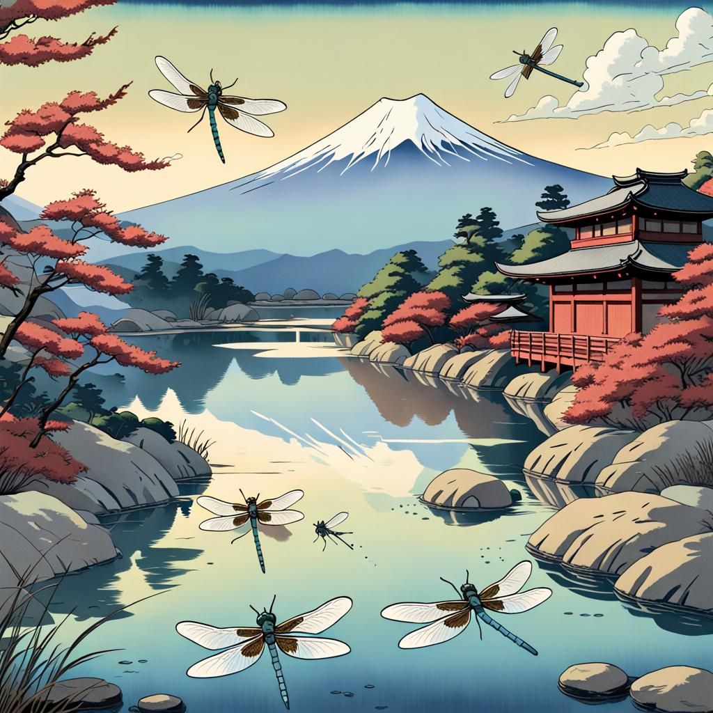 This image shows dragonflies above a pond with Mount Fuji in the background. The artwork is rendered in the style of Japanese Ukiyo-e woodblock prints, with flat colors and cinematic lighting.