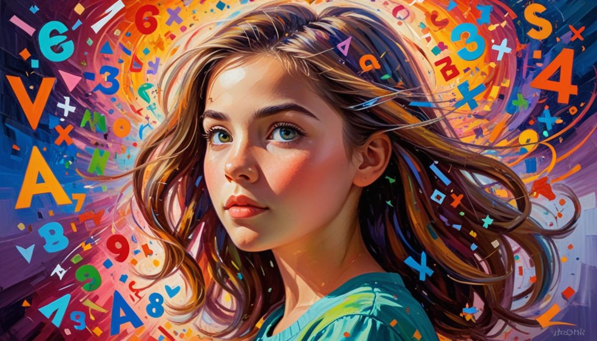 This expressive oil painting captures a young girl contemplating a math problem. Colorful symbols fill the air around her, rendered with playful, vibrant Fauvist brushstrokes and cheerful colors.
