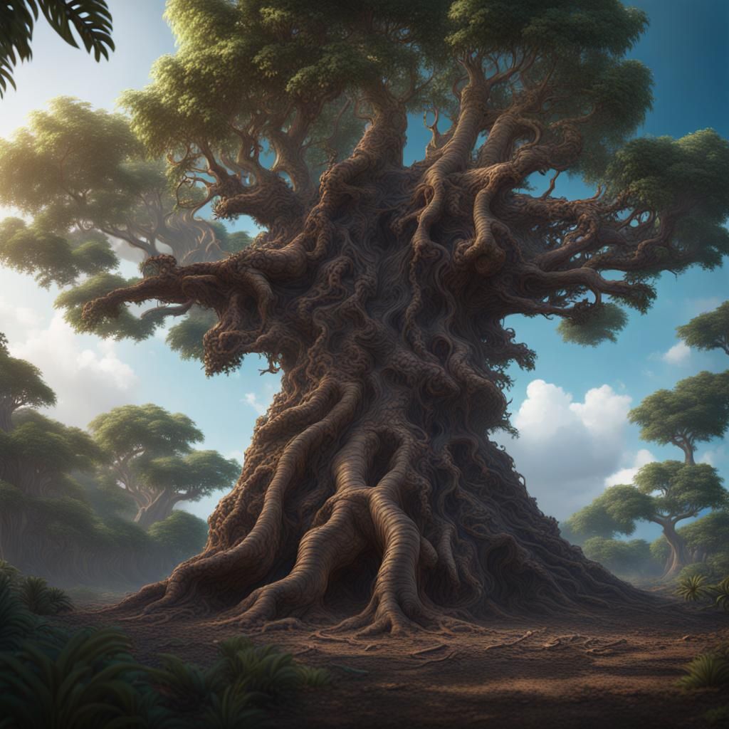 This image shows a detailed matte painting of a ceiba tree. The fantastical concept art uses deep color and intricate detail, rendered in 8k resolution with complementary colors.