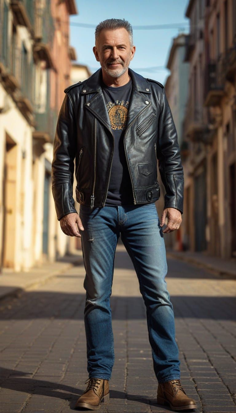 This image showcases a photorealistic, full-length portrait of a smiling 55-year-old man. He's dressed in a metal head outfit, leather jacket, graphic tee, and biker boots, bathed in warm golden hour light.