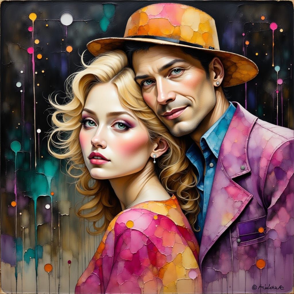 A surreal portrait of a blonde woman and Barry Manilow in a dreamlike scene, created with liquid ink and ethereal effects