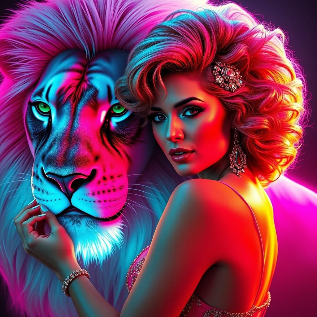 This image features a close-up of a beautiful, exotic woman with fluffy hair and lavish attire, surrounded by the vibrant glow of a pink neon lion, evoking the mystique of a futuristic, cyberpunk femme fatale in a style reminiscent of Art Deco elegance and vibrant, dreamlike realism.