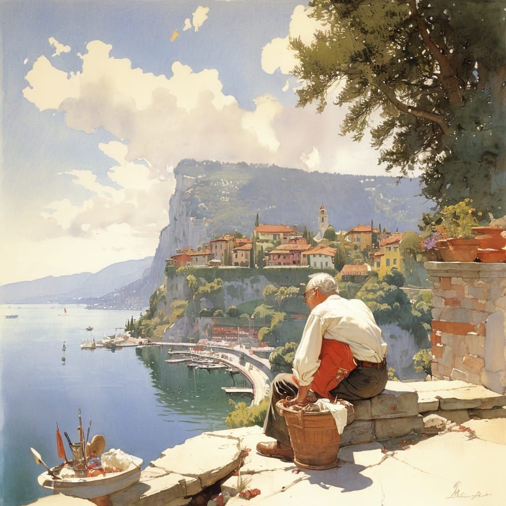 A sun-drenched Impressionist watercolor of a Mediterranean landscape. The vintage scene evokes Lake Garda, Italy, rendered with layered brushstrokes. This artwork captures a serene lakeside view.