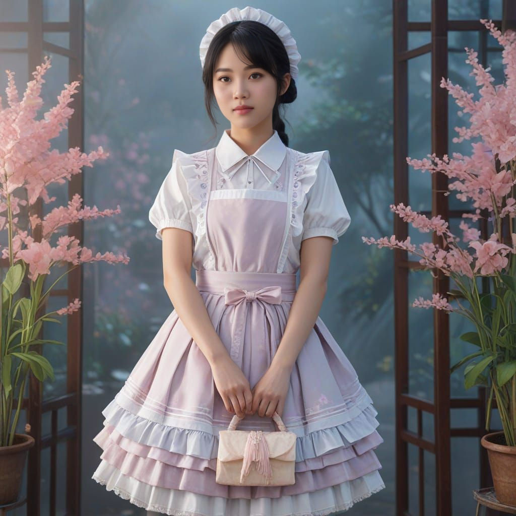 This image shows a full-bodied Vietnamese woman with a captivating aura, wearing a detailed black and white anime-inspired maid outfit. The setting features atmospheric lighting in a minimalist, realistic style.