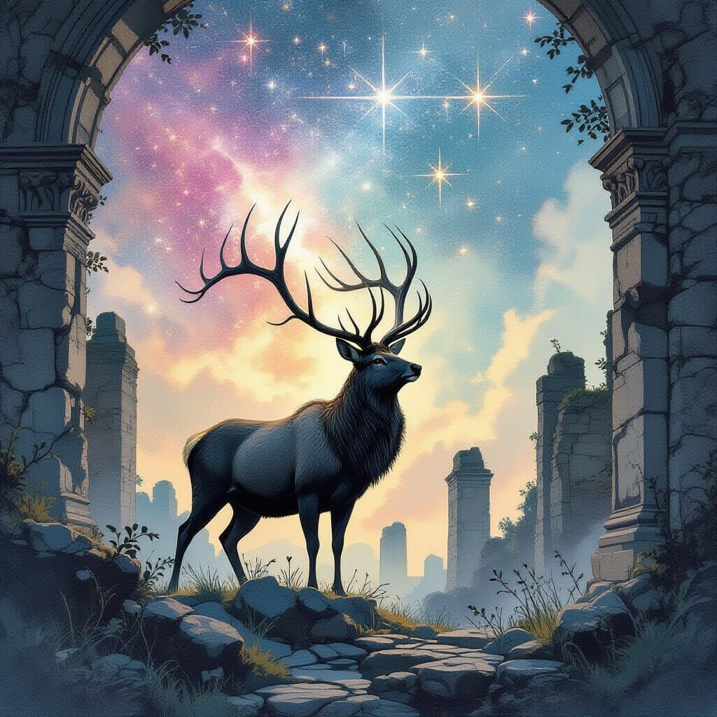 This image depicts a noble stag in ancient ruins, with stardust on its antlers, illuminated by a nebula's soft light. It features watercolor textures and minimalist line art.
