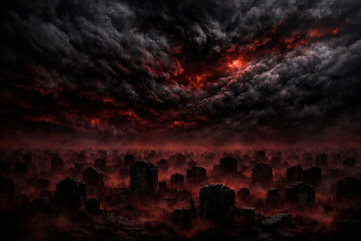 This image depicts a vast, oppressive cemetery under a menacing night sky. Thick, blood-red fog blankets the landscape, obscuring gravestones and creating a sense of dread and confinement. The sky itself is a churning mass of dark clouds with an unsettling red glow.