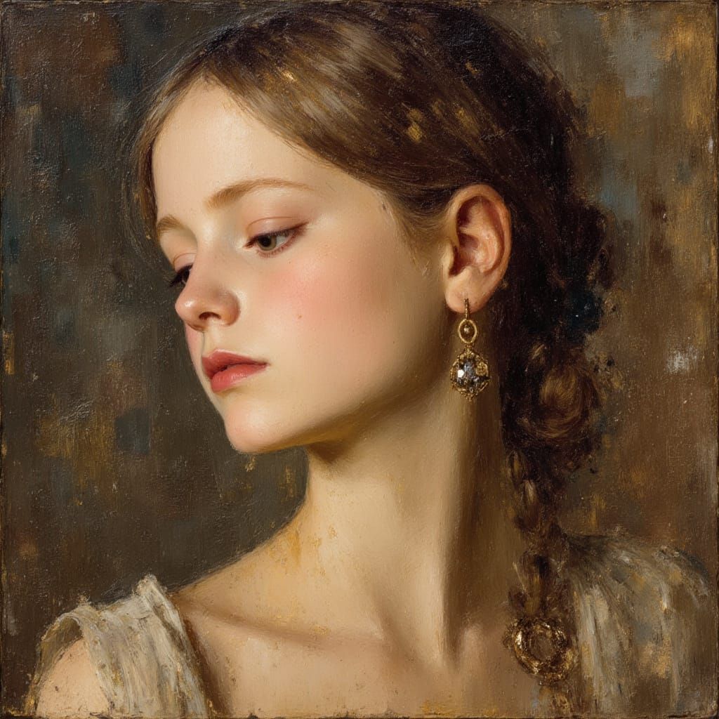 This image shows a demure princess in a 3/4 profile oil portrait. She is depicted with bright eyes and summer colors, using impasto and encaustic techniques reminiscent of old master paintings.