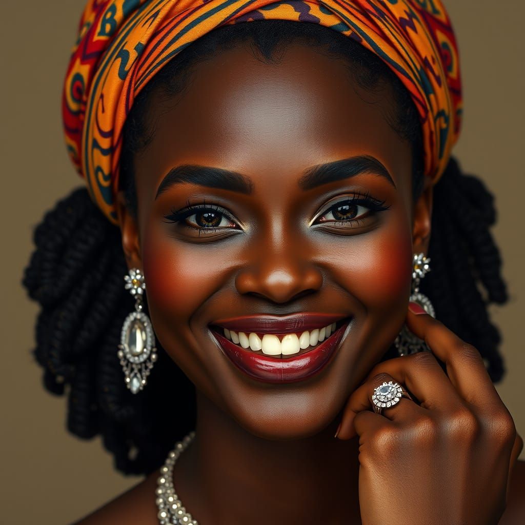 This image features a dark skinned woman adorned in exquisite Cartier style jewelry, showcasing a delicate diamond necklace, elegant earrings, and a sophisticated ring, all rendered in stunning photo realistic detail with a touch of African cultural flair.