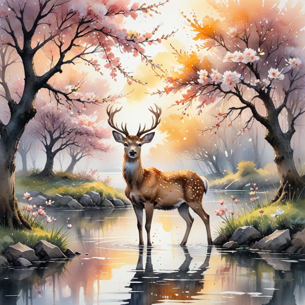 This image shows a gentle deer beside a pond reflecting a golden sunset, with soft mist. It features a stylized watercolor aesthetic inspired by expressive, ethereal, and cinematic art.