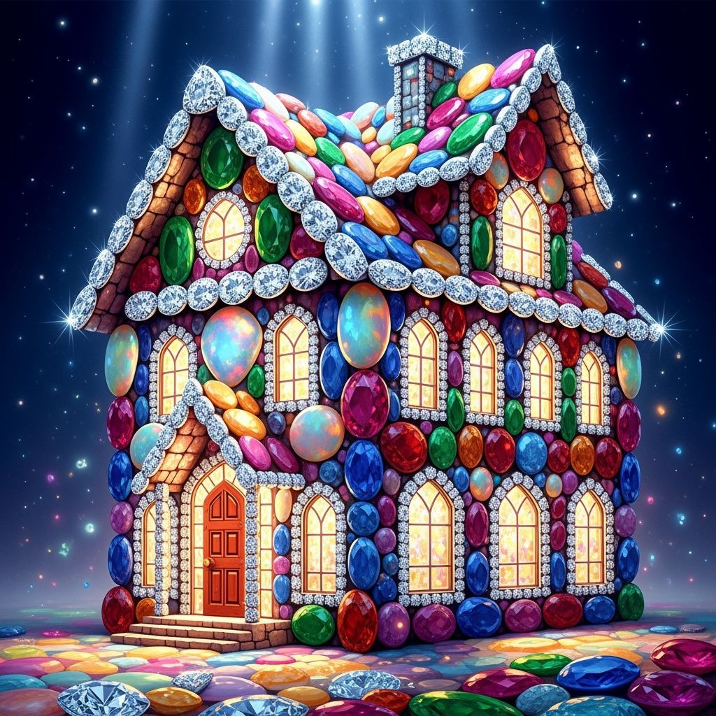 This hyperrealistic digital painting showcases a magical house built from diamonds, rubies, emeralds, and sapphires. It radiates an inner glow, with light beams catching gemstone facets for an enchanting, iridescent display.