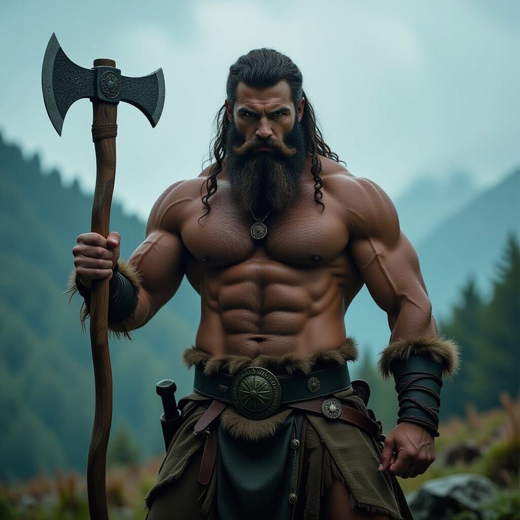 This image depicts Basajaun, a powerful and hairy figure from Basque folklore, holding an axe. Rendered with cinematic quality, it features dramatic lighting and a distinct film grain.