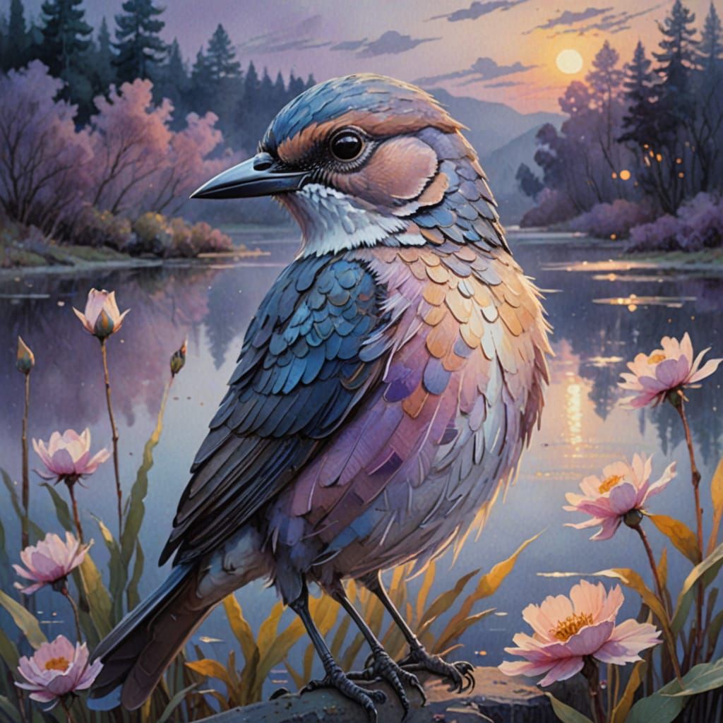 This enchanting watercolor painting captures a nightingale's serene moment, playing a tiny flute on a misty lake shore under a vibrant sunset sky with soft, feathery clouds. Expressive brushstrokes and layered textures evoke a dreamy, ethereal quality.