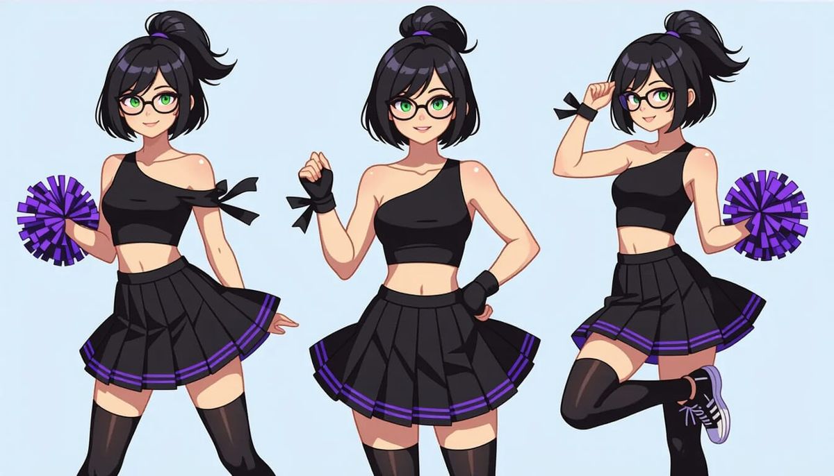 This image shows a woman with pale skin and a black bob haircut in a dynamic pose. She wears a black cheerleading outfit with violet accents against a gray backdrop, rendered in a painterly anime style.