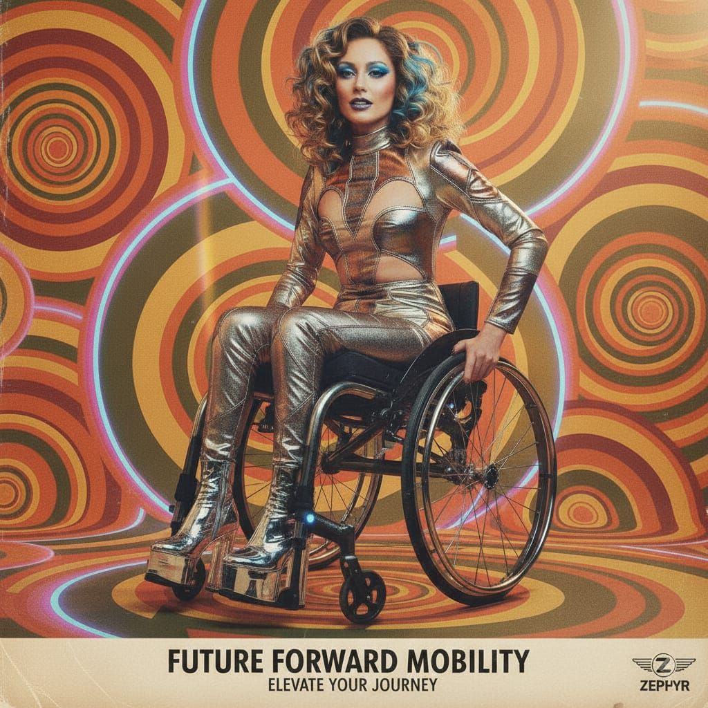 This image showcases a 2025 fashion concept with a 1970s magazine ad aesthetic. It features a paraplegic model in a metallic jumpsuit and wheelchair against abstract, earthy patterns.