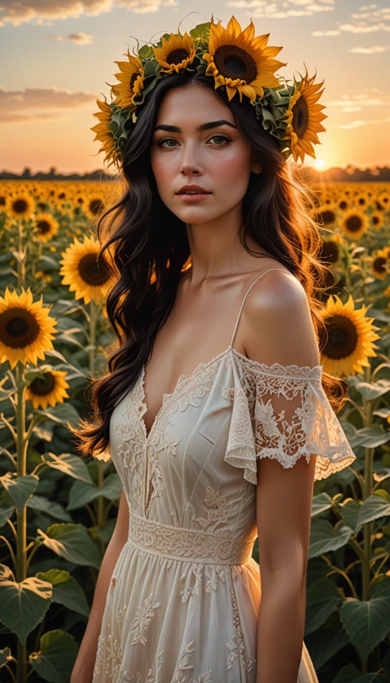 A stunning woman in a white dress stands in a sunflower field at sunset. The image captures the warm, golden light with soft brushstrokes, reminiscent of impressionist paintings.