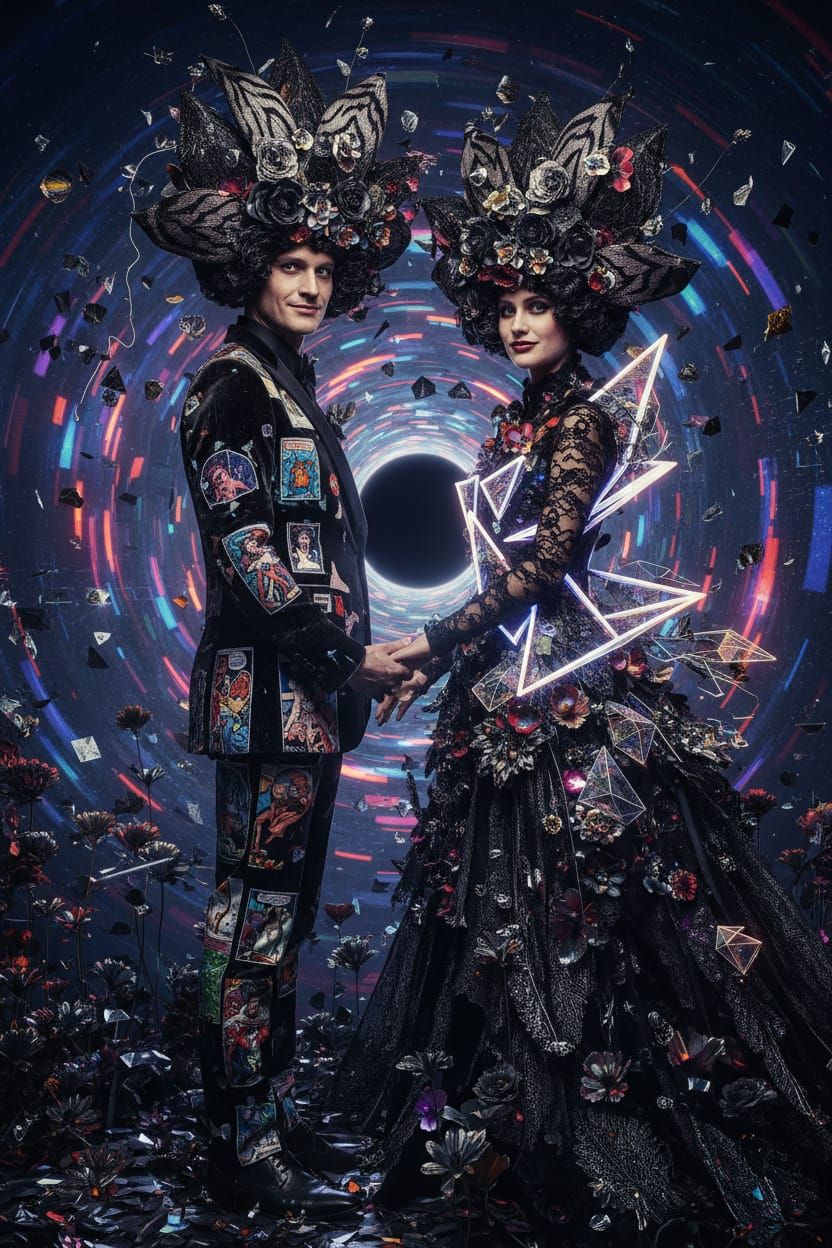 jugglenaut petallic most maligned black hole poststructural glitchcore artifacts romanticism couple dressed in goth satire tigerLilliputian leno weave pattern petallic plush millinery grown-up cosmicbook slightly cheeky winsome eyes absolutely no text should appear in this image