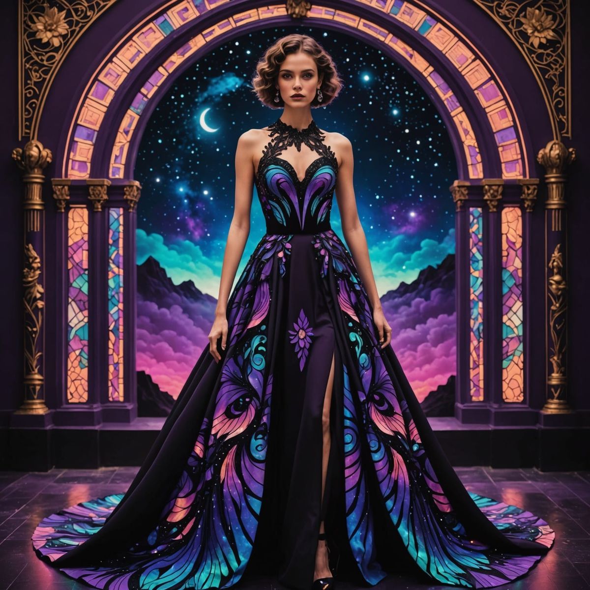 This image features a formal dress with a night sky-inspired purple-black hue, glowing vibrantly with a spectrum of neon colors in a dramatic, maximalist style.