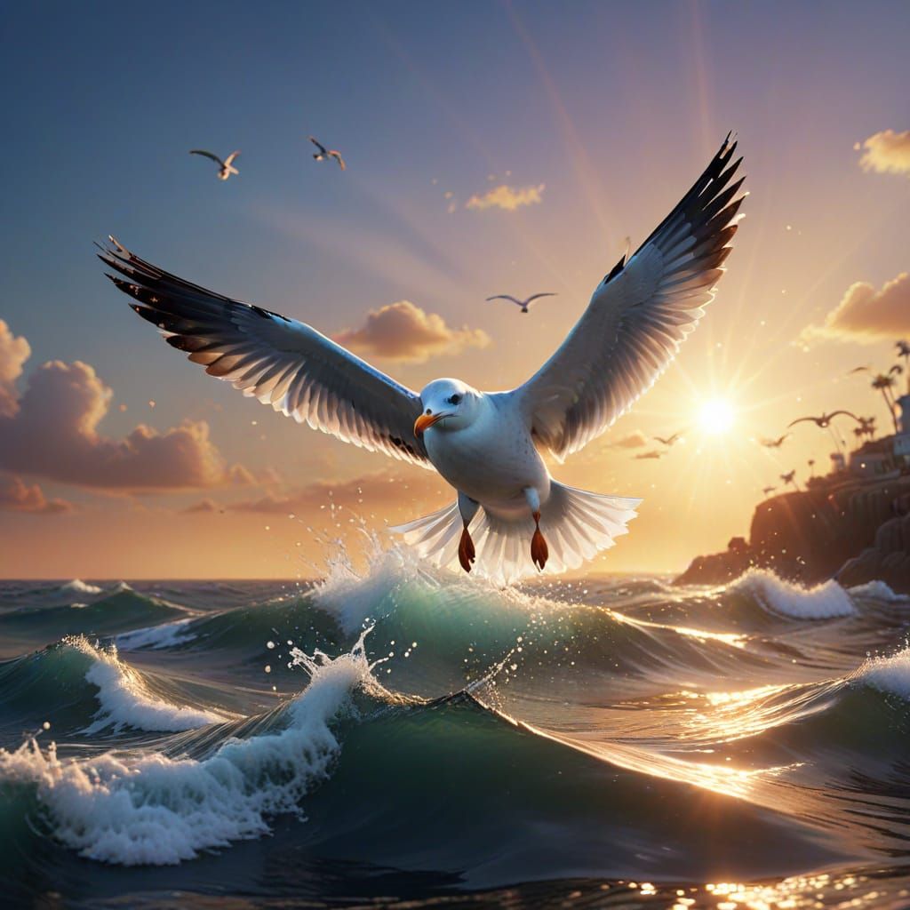A stunning 3D concept art piece featuring a seagull soaring over the ocean, set against a bright and colorful radial gradient background, with shimmering sunlight and iridescent feathers.