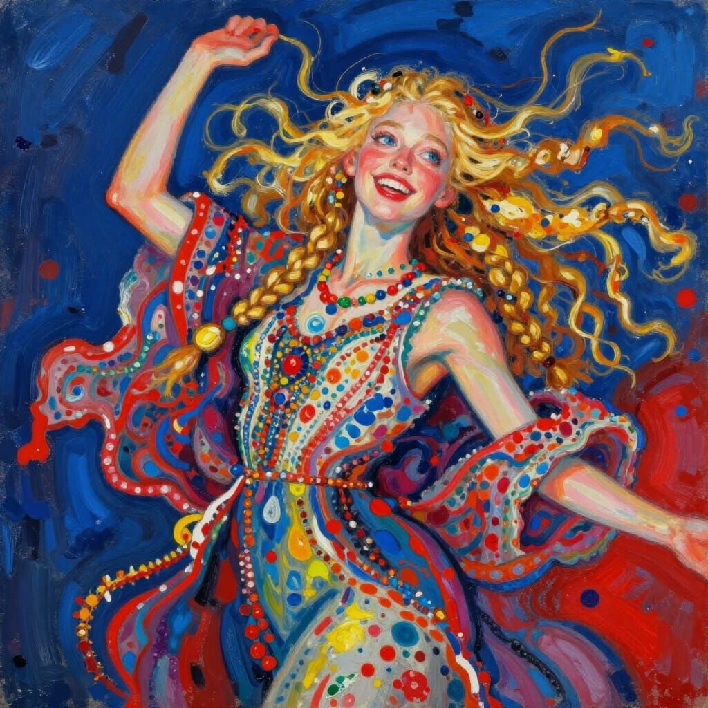 A vibrant artwork captures a young woman with long, sun-streaked blonde hair in a state of unbridled, kinetic joy. Her physical appearance is radiant, featuring a wide, toothy grin and bright blue eyes that sparkle with a sense of celebratory ecstasy. She is dressed in a highly ornate, folk-inspired gown bursting with a mosaic of multicolored dots, jewels, and intricate patterns in primary reds, yellows, and blues. Her posture is dynamic and expansive, with her arms raised and hair swirling as if she is caught in the midst of a whirling, traditional dance. The artwork communicates a message of cultural vitality and the liberation of the spirit; the thick, rhythmic impasto brushwork and the deep sapphire background create a mood of festive magic. Symbolically, the explosion of colorful patterns against the dark sky represents the power of human tradition and individual happiness to illuminate even the vastest of voids.