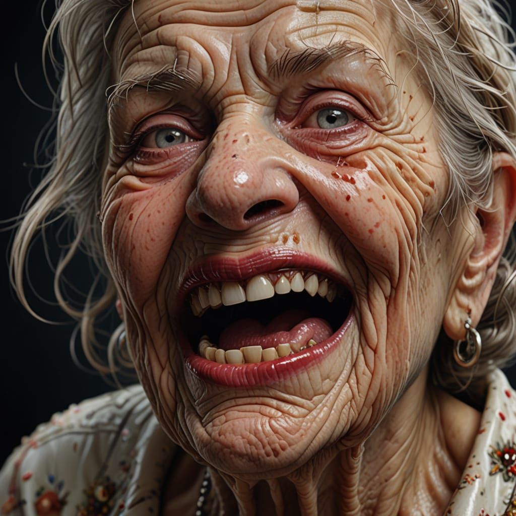 This image shows a close-up of a decaying old woman's face, with vibrant brushwork and hyper-realistic details, as she attempts to give a kiss. The artwork combines acrylic and digital media for a maximalist effect.