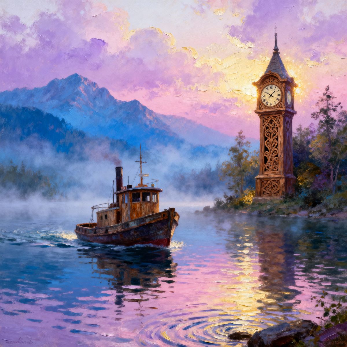 This image shows a serene lake scene at dusk, featuring a tugboat, distant mountains, and a wooden clock tower. Rendered with detailed, painterly brushstrokes and rich impasto textures for an ethereal fantasy feel.