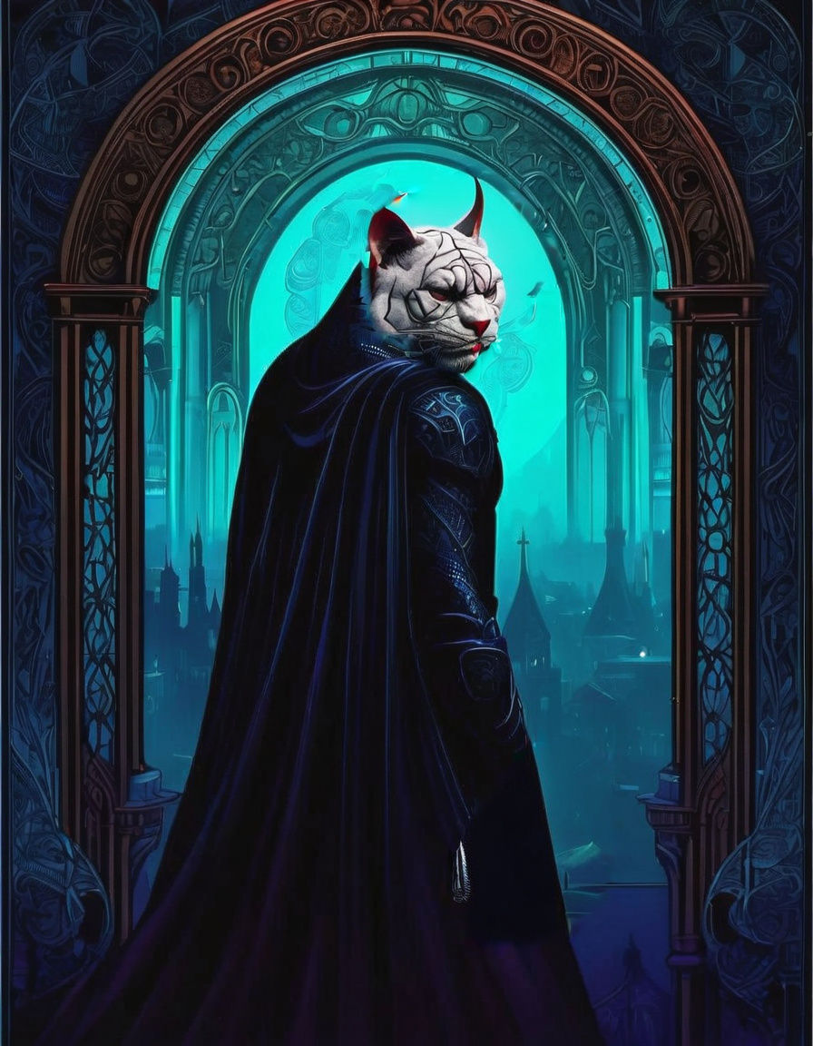 A sleek black panther in a jeweled crown and crimson cape surveys a gothic cityscape from a high balcony. The image features dark art nouveau elements with dramatic lighting and rich colors.