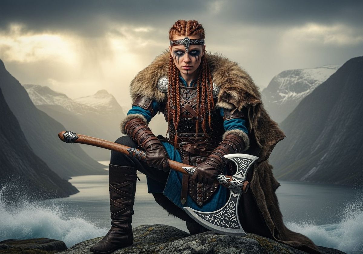 This image shows a female viking warrior. The artwork portrays a powerful woman in a fantasy setting.