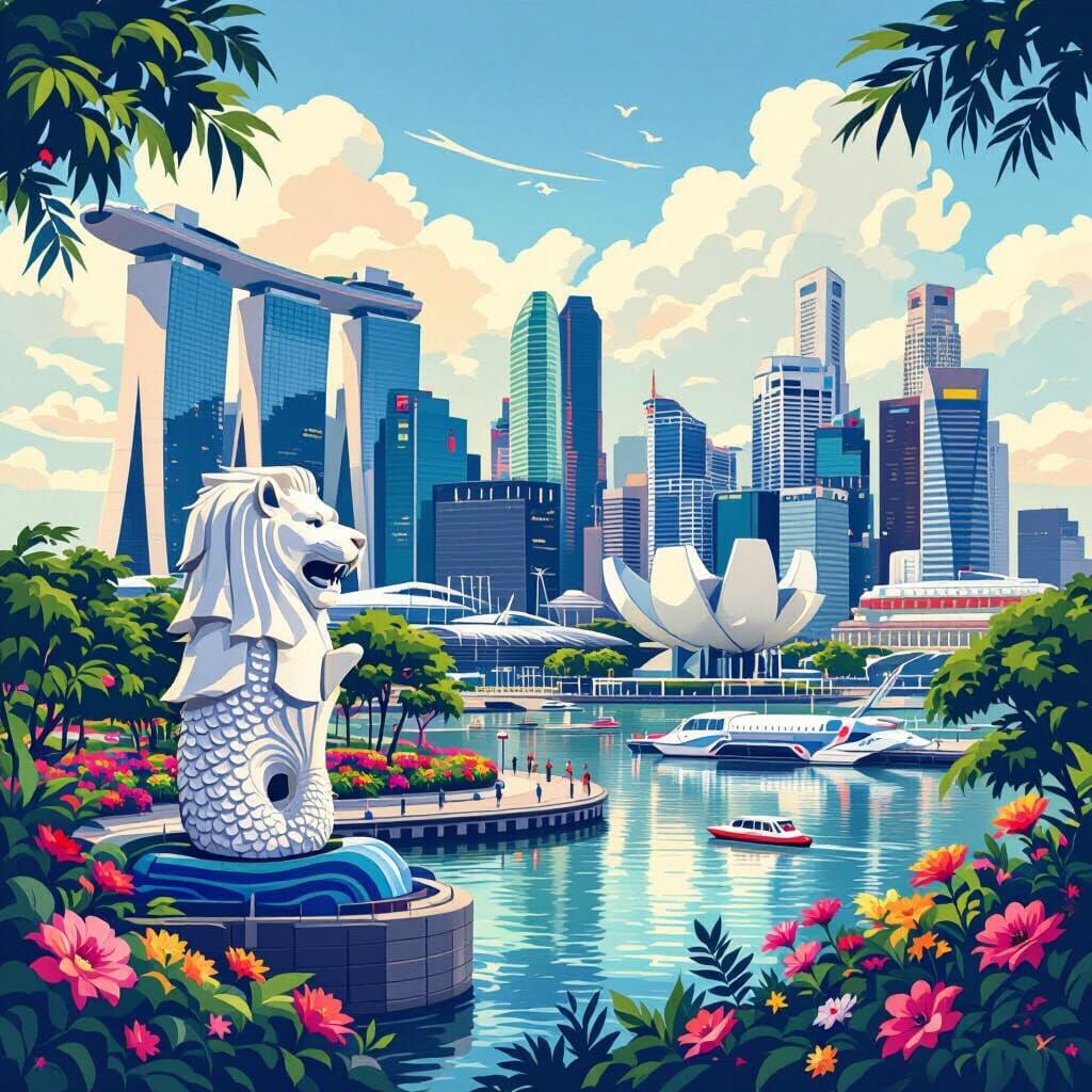 A vibrant cityscape illustration of Singapore, featuring the Merlion statue, Gardens by the Bay, Singapore Zoo, Marina Bay Sands, and Changi Airport in a stylized digital art style.