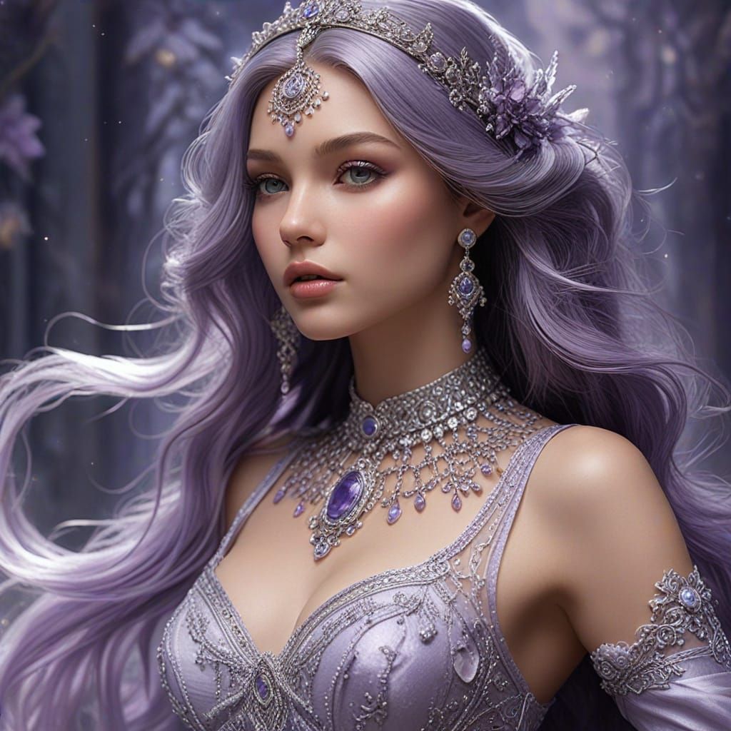 This image showcases a mystical figure in flowing silk, surrounded by intricate patterns and celestial motifs, set against a dreamy, ethereal backdrop with soft, pure colors and shimmering accents.