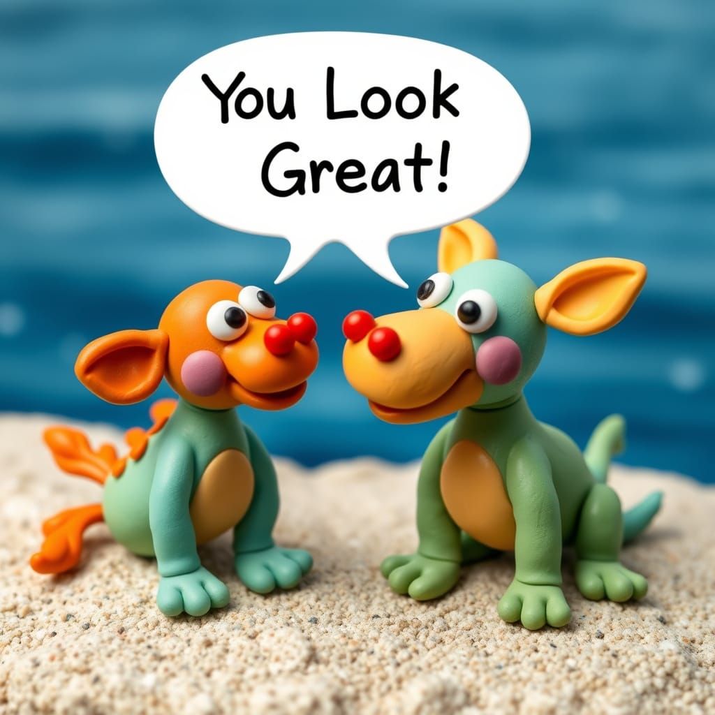 This image shows two claymation animals in conversation against an ocean backdrop. The whimsical illustration features vibrant colors, beaded eyes, and hot pepper mouths.