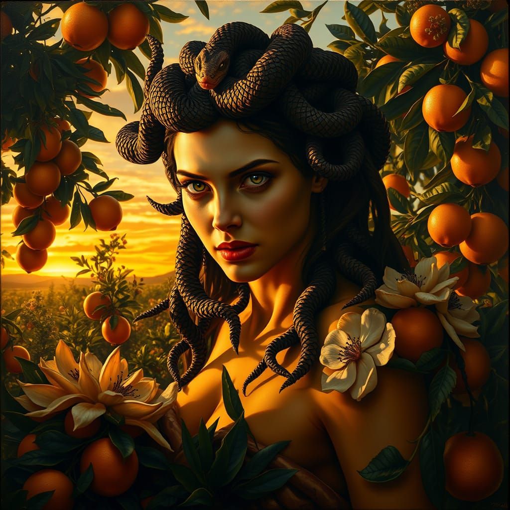 A dramatic oil painting captures Medusa amidst a vibrant orange grove at sunset. Her serpentine hair and melancholic gaze are rendered with intense color and dramatic shadows in a Baroque style.