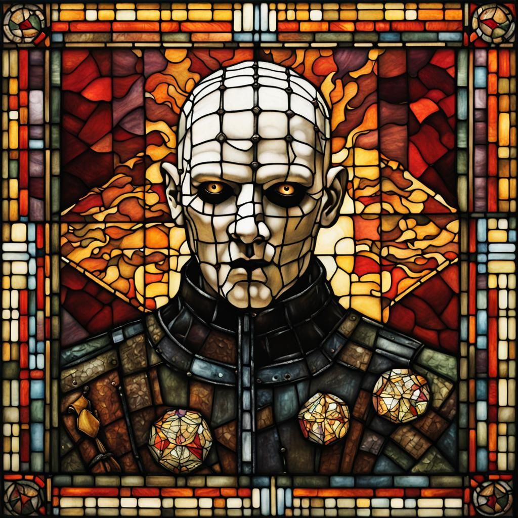 Antique stained-glass window of a full sized Lifelike Pinhead, looking up, from the movie Hellraiser, rising from flames and smoke from hell, holding his square puzzle box, in shades of red, black, browns yellows, greens, purples, oranges, and white and grays, for his pins done in wrought iron,