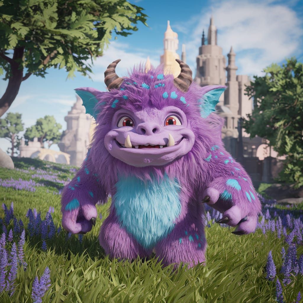 This image showcases a detailed fantasy concept art of a purple, furry monster with blue spots and horns. It stands in a field before a castle under a clear sky, rendered in deep colors and intricate detail.